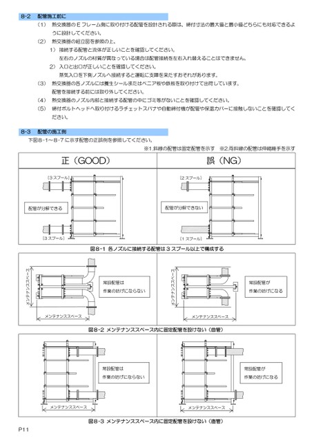 8-2配管施工前に(1)熱交換器のEフレーム側に取り付ける配管を設計される際は、締付寸法の最大値と最小値どちらにも対応できるように設計してください。(2)熱交換器の組立図を参照の上、1)接続する配管と流体が正しいことを確認してください。左右のノズルの材質が異なっている場合は配管接続を左右入れ替えることはできません。2)入口と出口が正しいことを確認してください。蒸気入口を下側ノズルへ接続すると運転に支障を来たすおそれがあります。(3)熱交換器の各ノズルには養生シールまたはベニア板や鉄板を取り付けて出荷しています。配管を接続する前には取り外してください。(4)熱交換器のノズル内部と接続する配管の中にゴミ等がないことを確認してください。(5)締付ボルトヘッドへ取り付けるラチェットスパナや自動締付機が配管や保温カバーに接触しないことを確認してください。8-3配管の施工例下図8-1~8-7に示す配管の正誤例を参照してください。正(GOOD)誤(NG)※1.斜線の配管は固定配管を示す※2.両斜線の配管は伸縮継手を示す[3スプール][2スプール]常設配管が作業の妨げになるメンテナンススペース常設配管は作業の妨げにならないメンテナンススペースメンテナンススペースメンテナンススペース図8-2メンテナンススペース内に固定配管を設けない(曲管)[3スプール][1スプール]図8-1各ノズルに接続する配管は3スプール以上で構成する配管が分解できる配管が分解できない常設配管は作業の妨げにならない常設配管が作業の妨げになるメンテナンススペースメンテナンススペースP11図8-3メンテナンススペース内に固定配管を設けない(直管)