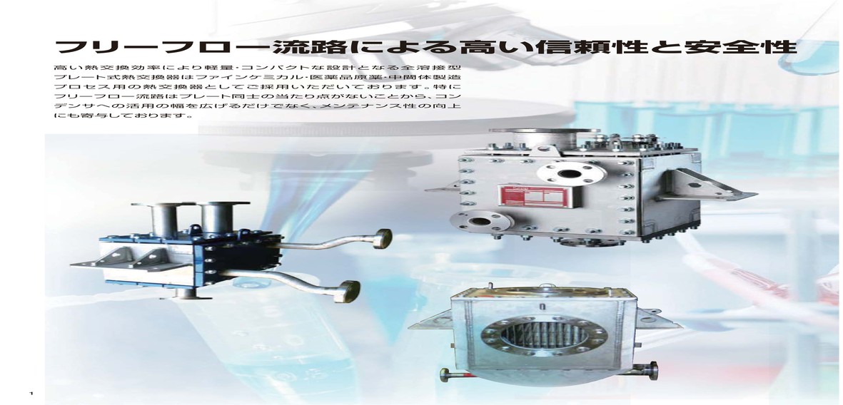 フリーフロー流路による高い信頼性と安全性高い熱交換効率により軽量・コンパクトな設計となる全溶接型プレート式熱交換器はファインケミカル・医薬品原薬・中間体製造プロセス用の熱交換器としてご採用いただいております。特にフリーフロー流路はプレート同士の当たり点がないことから、コンデンサへの活用の幅を広げるだけでなく、メンテナンス性の向上にも寄与しております。1
