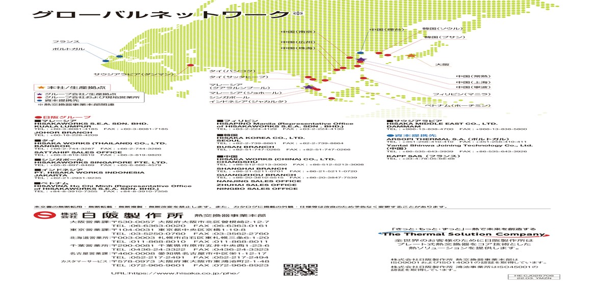 グローバルネットワーク※フランスポルトガルサウジアラビア(ダンマン)本社/生産拠点グループ会社/生産拠点グループ会社および現地営業所資本提携先※熱交換器事業本部関連●日阪グループ■マレーシアHISAKAWORKSS.E.A.SDN.BHD.KUALALUMPURTEL:+60-3-8081-4185JOHORBRANCHTEL:+60-16-228-4209FAX:+60-3-8081-7185■タイHISAKAWORKS(THAILAND)CO.,LTD.BANGKOKTEL:+66-2-744-3287FAX:+66-2-744-3286SATTAHIPSALESOFFICETEL:+66-3-819-9819FAX:+66-3-819-9820■シンガポールHISAKAWORKSSINGAPOREPTE.LTD.TEL:+65-6-897-8489FAX:+65-6-686-4579■インドネシアPT.HISAKAWORKSINDONESIAJAKARTATEL:+62-21-2931-9235■ベトナムHISAVINAHoChiMinhofHISAKAWORKSS.E.A.SDN.BHD.)TEL:+84-8-3910-7355FAX:+84-8-3910-7356(RepresentativeOffice中国(煙台)韓国(ソウル)韓国(プサン)中国(南京)中国(広州)中国(珠海)タイ(バンコク)タイ(サッタヒープ)マレーシア(クアラルンプール)マレーシア(ジョホール)シンガポールインドネシア(ジャカルタ)大阪中国(常熟)中国(上海)中国(寧波)フィリピン(マニラ)ベトナム(ホーチミン)■フィリピンHISAPINOManila(RepresentativeOfficeofHISAKAWORKSS.E.A.SDN.BHD.)TEL:+63-2-224-4129FAX:+63-2-224-4130■サウジアラビアHISAKAMIDDLEEASTCO.,LTD.DAMMAMTEL:+966-13-838-4700FAX:+966-13-838-5800●資本提携先ARSOPITHERMALS.A.(ポルトガル)TEL:+351-256-410-410FAX:+351-256-410-411YantaiShinwaJoiningTechnologyCo.,Ltd.(中国)TEL:+86-535-643-3939FAX:+86-535-643-3926KAPPSAS(フランス)TEL:+33-4-78-05-68-68■韓国HISAKAKOREACO.,LTD.SEOULTEL:+82-2-739-8861FAX:+82-2-739-8864BUSANBRANCHTEL:+82-51-747-0265FAX:+82-51-747-0266■中国HISAKAWORKS(CHINA)CO.,LTD.CHANGSHUTEL:+86-512-5213-3000FAX:+86-512-5213-3008SHANGHAIBRANCHTEL:+86-21-5211-0701FAX:+86-21-5211-0720GUANGZHOUBRANCHTEL:+86-20-3810-5515FAX:+86-20-3847-7539NANJINGSALESOFFICEZHUHAISALESOFFICENINGBOSALESOFFICE熱交換器事業本部大阪営業課:〒530-0057大阪府大阪市北区曽根崎2-12-7TEL:06-6363-0020FAX:06-6363-0161東京営業課:〒104-0031東京都中央区京橋1-19-8TEL:03-5250-0760FAX:03-3562-2760北海道営業所:〒003-0003札幌市白石区東札幌三条6-1-20TEL:011-868-8010FAX:011-868-8011千葉営業所:〒290-0081千葉県市原市五井中央西1-23-6TEL:0436-24-3322FAX:0436-24-3323名古屋営業課:〒460-0008愛知県名古屋市中区栄1-12-17TEL:052-217-2491FAX:052-217-2494:〒578-0973大阪府東大阪市東鴻池町2-1-48TEL:072-966-9601FAX:072-966-8923カスタマーサービスURL:https://www.hisaka.co.jp/phe/「きっと・もっと・ずっと」ー熱で未来を創造する株式会社日阪製作所熱交換器事業本部はISO9001およびISO14001の認証を取得しています。株式会社日阪製作所鴻池事業所はISO45001の認証を取得しています。HE-CJ02570622.03.YMZN