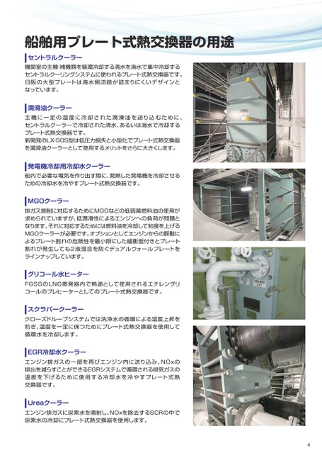 船の中で日阪のプレート式熱交換器が数多く活躍しています セントラルクーラー、潤滑油クーラー、発電機冷却用冷却水クーラー、MGOクーラー